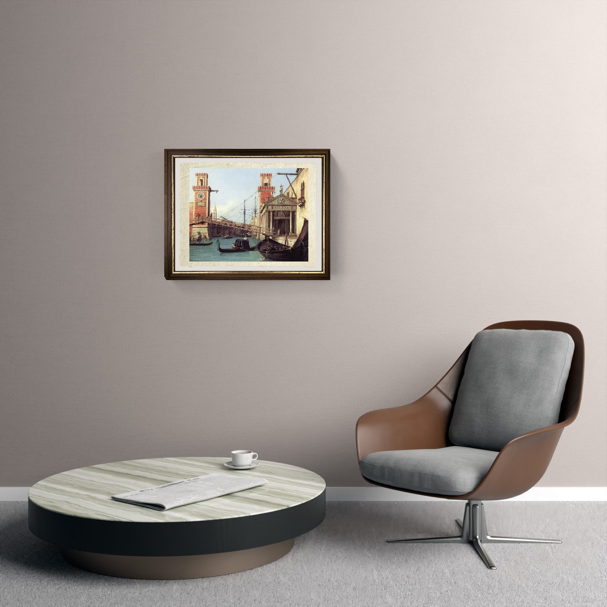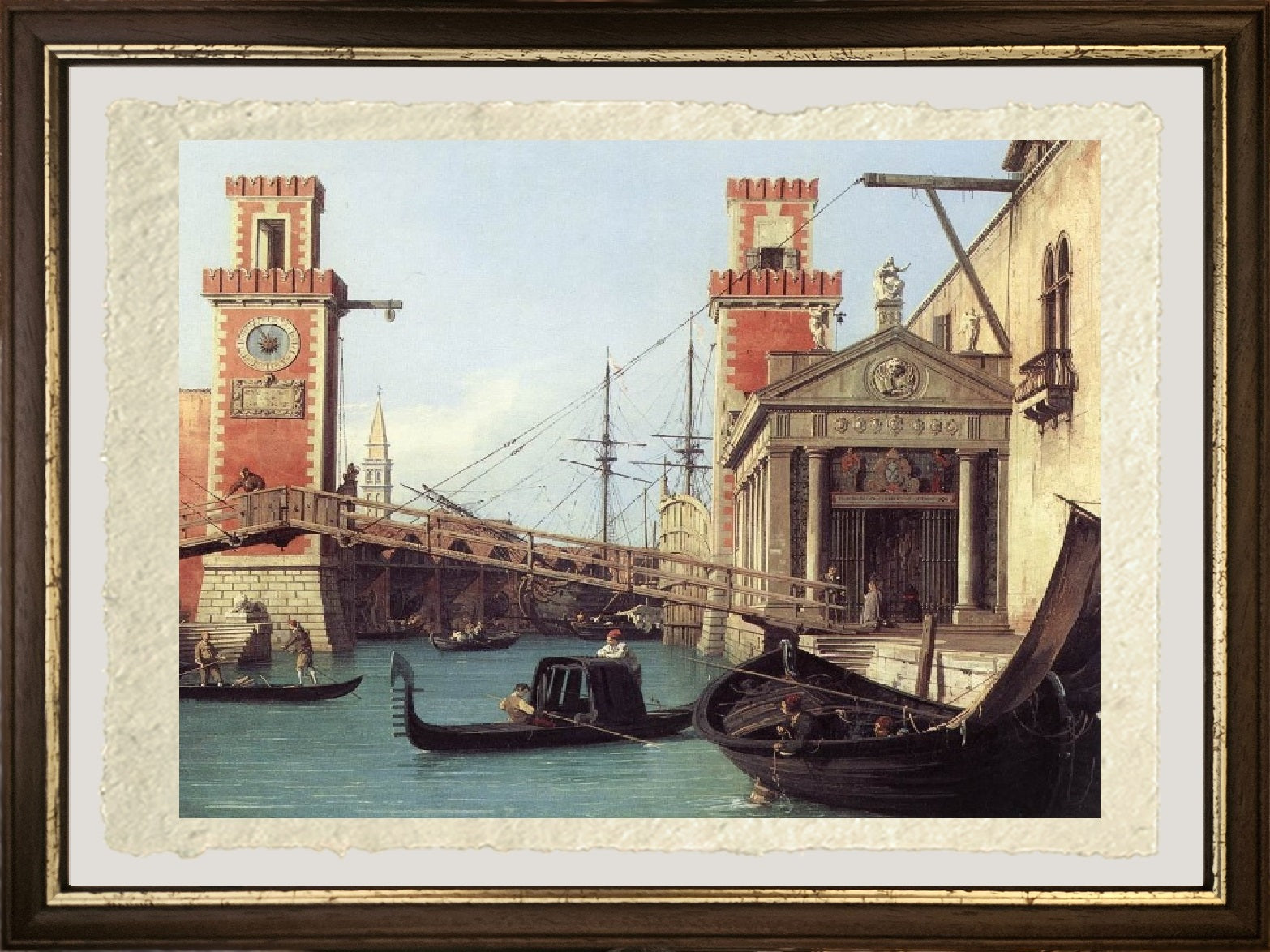 Originale luminosa veduta dell'ingresso all'Arsenale di Venezia, realizzata da Giovanni Antonio Canal detto Canaletto. In primo piano troviamo il canale, con l'imbarcazione ancorata a riva sul lato destro del dipinto, e delle gondole in manovra. A collegare le due sponde del canale c'è il ponte, e dietro a questo vi sono le due porte dell'Arsenale, le quali custodiscono i segreti dei mastri d'ascia di Venezia. Il cielo è sereno di un azzurro vivace, con qualche nuvola bianca.