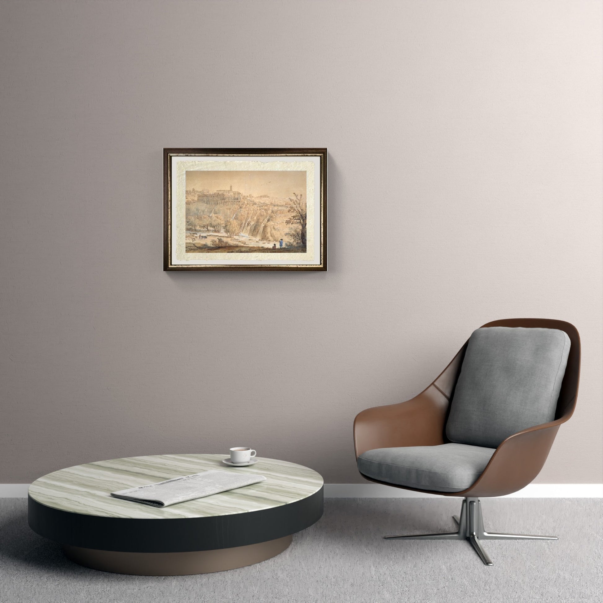Rarissima veduta storica del Monastero Basiliano dipinta da Gaspare Vanvitelli. Il Monastero si erge con le sue alte mura e degli archi, ma soprattutto delle piccole cascate. Il colore dominante è il marrone. Il monastero è ancorato su un colle, e viene osservato da alcuni spettatori posti su un colle vicino, i quali possono ammirare il paesaggio. Uno dei due visitatori è seduto e sta dipingendo il paesaggio.