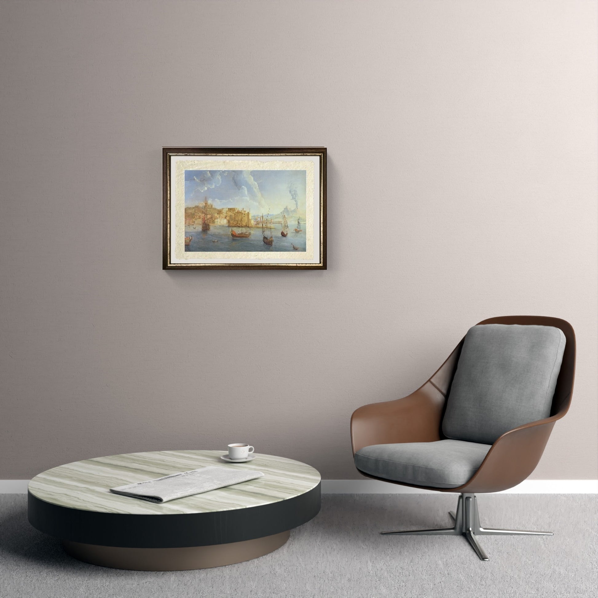 Luminosa e rara veduta storica del porto di Napoli e del Vesuvio fumante dipinta da Gaspare Vanvitelli. In primo piano viene rappresentato il porto e la fitta attività delle barche e dei velieri per i commerci. In evidenza è raffigurato il Castello dell'Ovo. Il cielo è nuvoloso ma il sole (non raffigurato nel quadro, perché supposto in posizione dell'osservatore) illumina il porto. Colore dominante del quadro un azzurro, presente in vaste zone del cielo e dell'acqua del golfo di Napoli. Il dipinto fa parte di una collezione privata. |