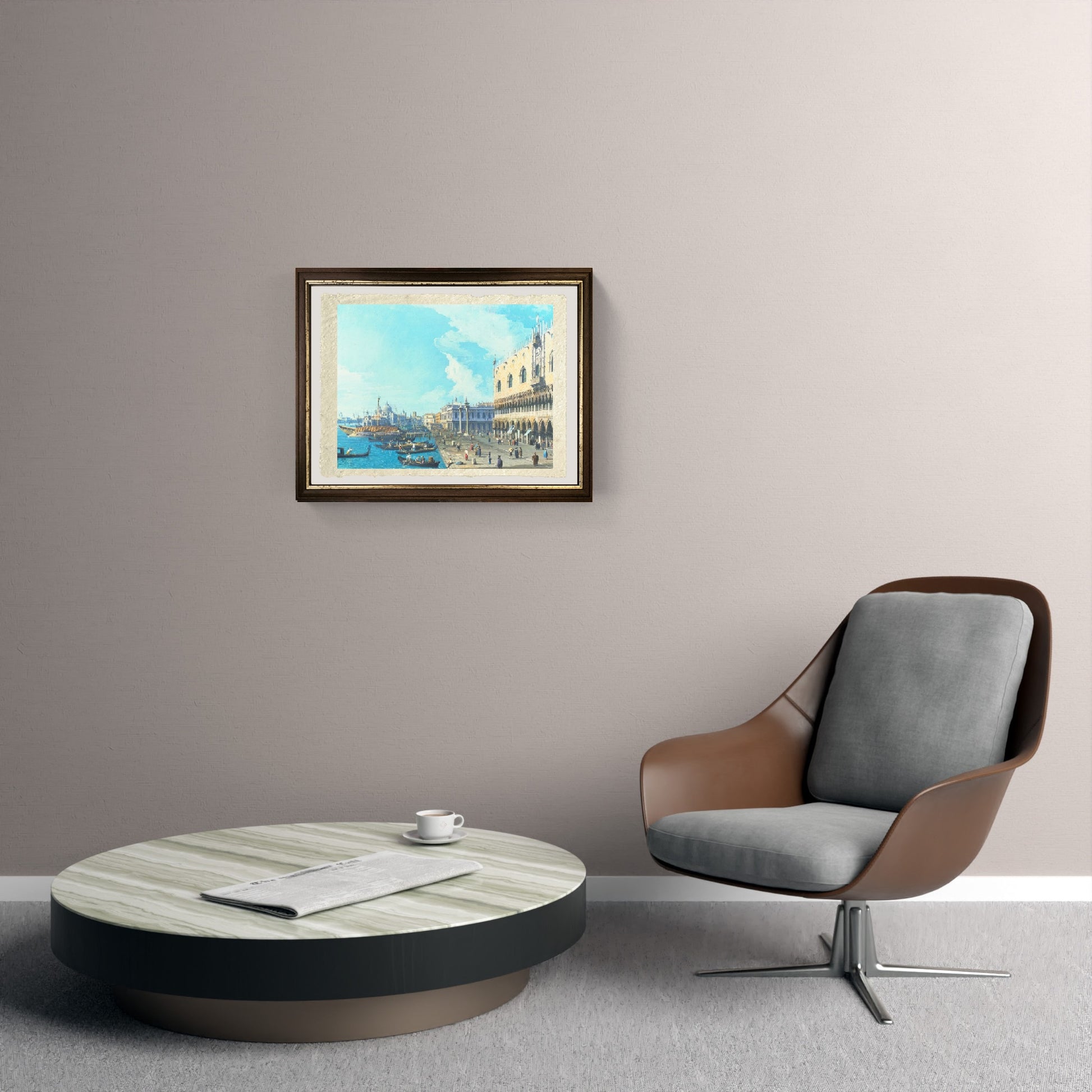 Originale luminosa veduta della piazzetta di San Marco con particolare delle colonne di San Todaro, e San Marco, realizzata da Giovanni Antonio Canal detto Canaletto. In primo piano troviamo la piazzetta, antistante palazzo Ducale, trafficata di gente, con il Molo ed alcune imbarcazioni ormeggiate. Più sullo sfondo c'è punta della Dogana con la bella chiesa di Santa Maria della Salute. Il cielo è sereno ma con qualche nuvola bianca all'orizzonte. Il colore dominante del dipinto è l'azzurro del cielo ed il blu chiaro dell'acqua della laguna.