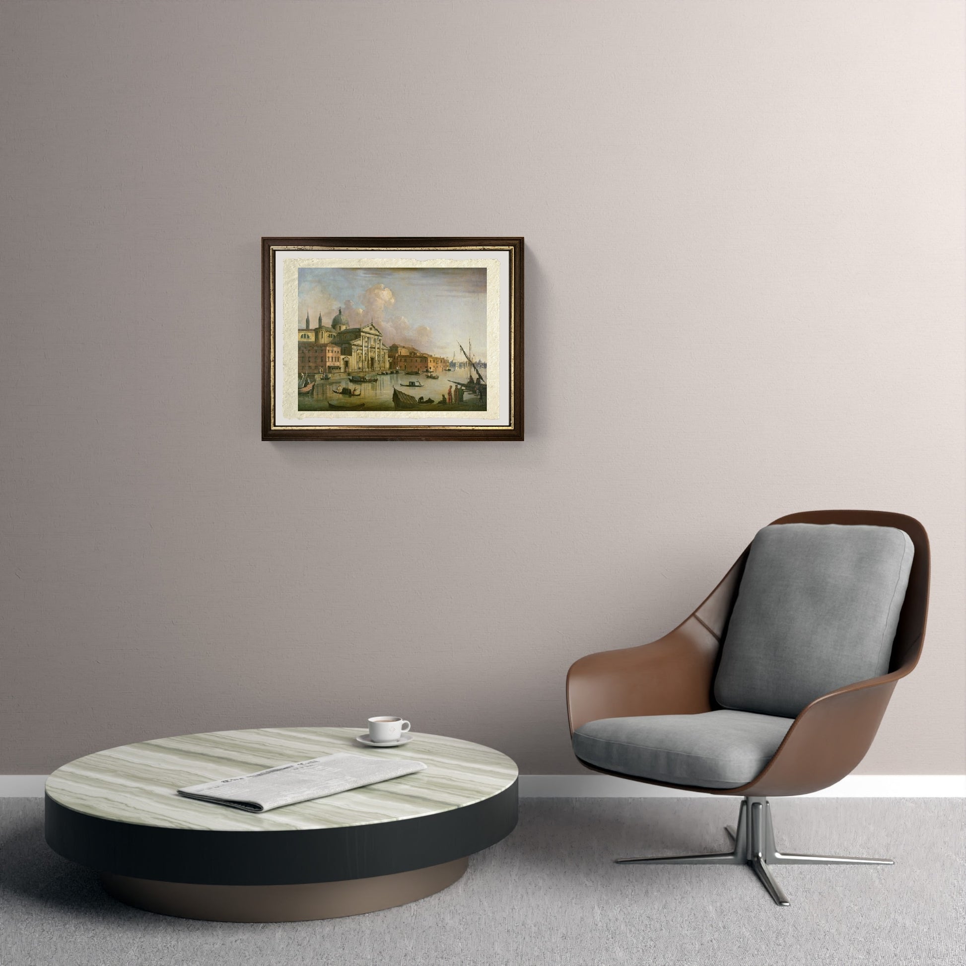 Originale e luminosa rappresentazione settecentesca dell'isola di San Giorgio, realizzata da Giovanni Antonio Canal detto Canaletto. In primo piano l'isola e la chiesa di San Giorgio, con qualche imbarcazione sul Canal Grande. La luce è di un sole al tramonto, il cielo è sereno, c'è qualche nuvola rosa-bianca, ma la giornata è buona. Il quadro, un olio su tela, non è datato.