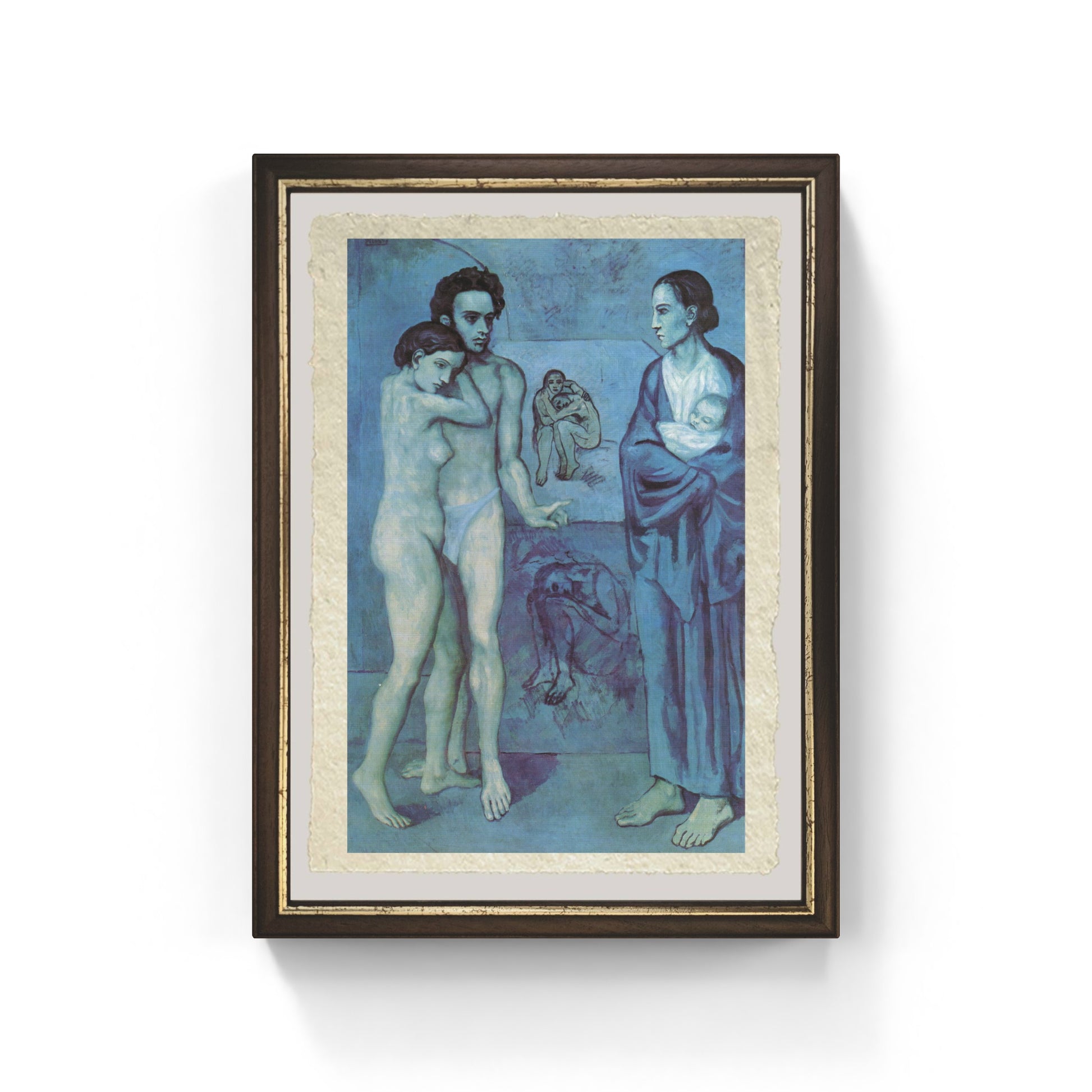 Una giovane donna nuda e un bambino creano un forte contrasto con la figura maschile pensosa e distaccata. Sullo sfondo, due quadri nel quadro aggiungono livelli di significato legati alla fragilità della vita, al conflitto interiore e al rapporto tra amore, sofferenza e destino. La Vie rappresenta una meditazione sulla condizione umana, manifestando una profonda sensibilità psicologica che definisce l’intera fase blu dell’artista.