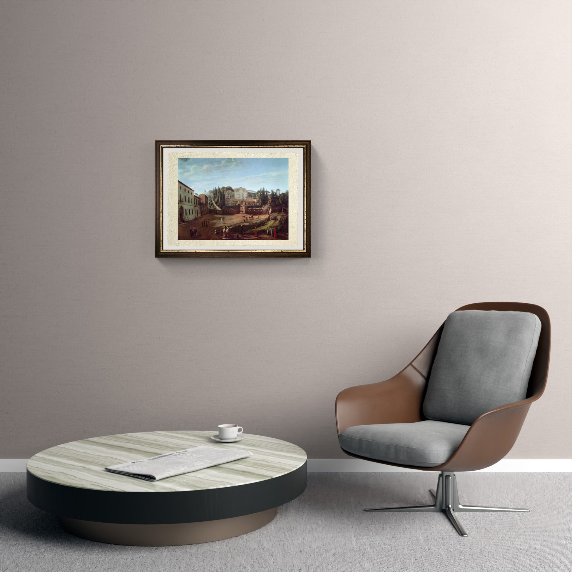 Settecentesca e romantica veduta storica di villa Aldobrandini, eseguita da Gaspare Vanvitelli. Vista da lontano, la villa è arroccata sul colle. Situata nel Tuscolano a Roma, per arrivarci un viale alberato con alti larici ai lati siti a destra del dipinto. A metà quadro è posta l'entrata con alcuni viandanti. Prima dell'entrata un grande piazzale con gente intenta nelle loro attività, mentre sulla sinistra un caseggiato. Da notare il cambio di tonalità del cielo, visto al tramonto con tonalità di blu intenso azzurro a schiarire sino al bianco.