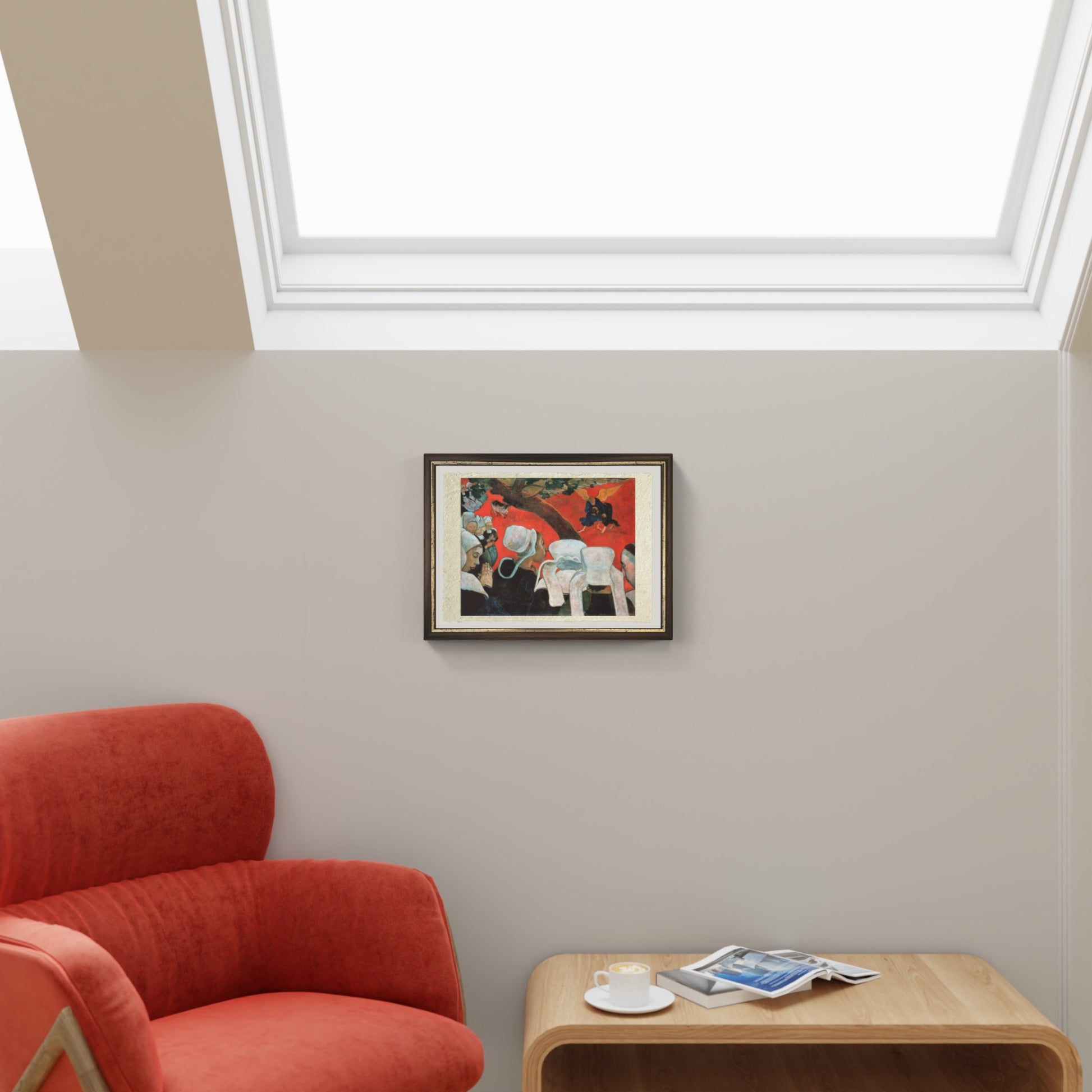 La visione dopo il sermone, è uno dei dipinti più emblematici della fase sintetista di Paul Gauguin. L’opera raffigura un gruppo di donne bretoni che, dopo aver assistito a un sermone, immaginano la scena biblica della lotta tra Giacobbe e l’angelo. Gauguin separa nettamente il mondo reale da quello spirituale attraverso l’uso del colore: il fondo rosso intenso crea uno spazio irreale e visionario, in cui la scena mistica prende forma. Le figure sono stilizzate, quasi bidimensionali, influenzate dalle stampe giapponesi, che l’artista ammirava molto.