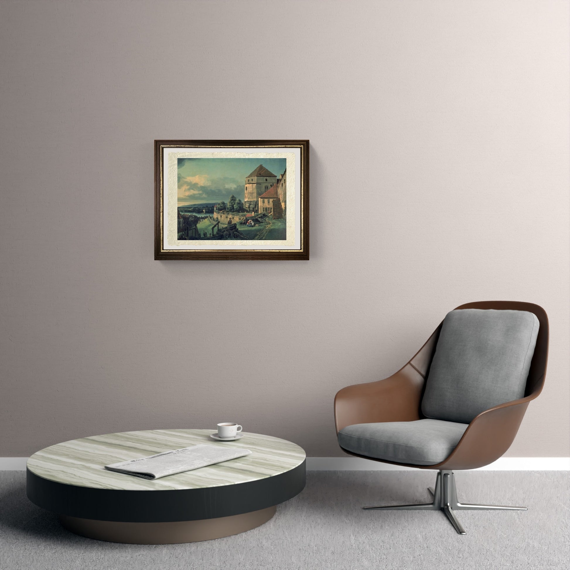 Luminosa ed originale veduta della cittadina di Pirna e del castello di Sonnenstein, realizzata da Bernardo Bellotto. In evidenza sul lato destro, possente e ben illuminato, troviamo il castello, mentre la cittadina di Pirna è più a valle con le sue case e palazzi. Il fiume Elba scorre nel lato sinistro del dipinto. Il cielo si sta annuvolando.