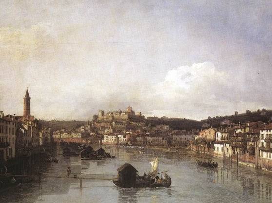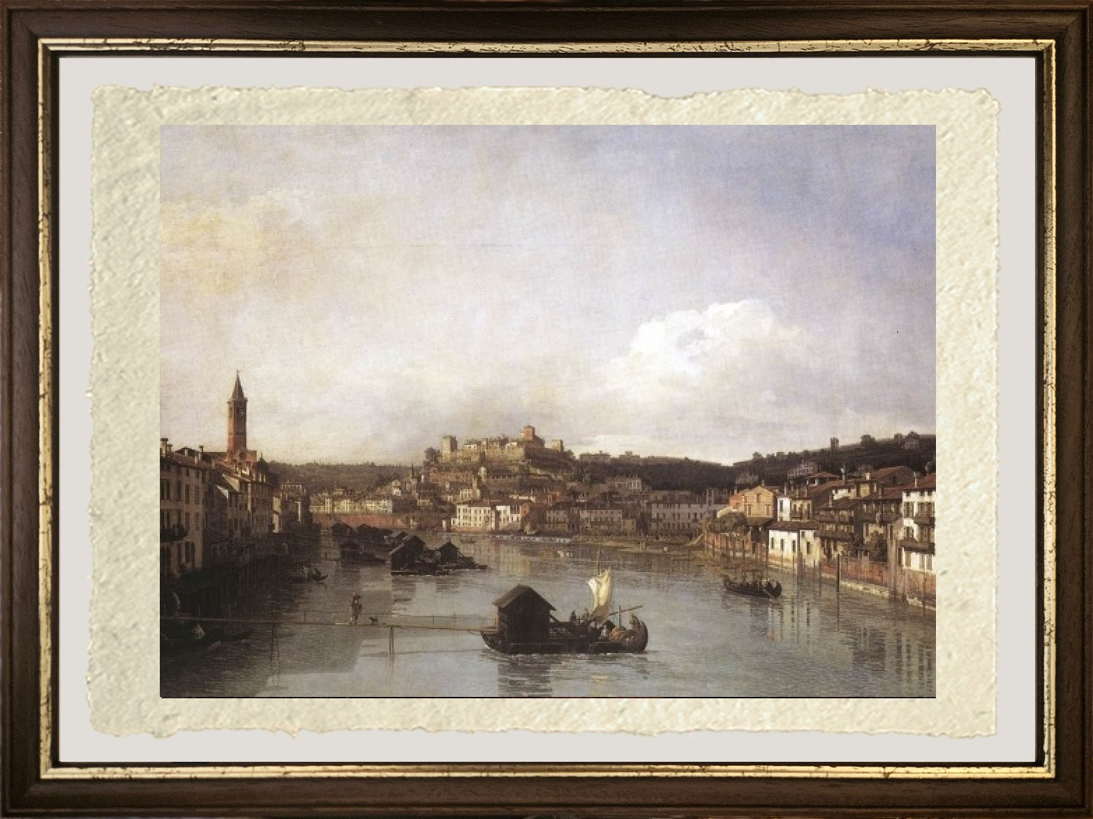 Rara e particolareggiata veduta storica settecentesca di Verona con vista del ponte Nuovo, realizzata da Bernardo Bellotto. In evidenza troviamo il fiume Adige, attraversato da alcune imbarcazioni, mentre il Ponte Nuovo appare sfumato sul fondo del dipinto.